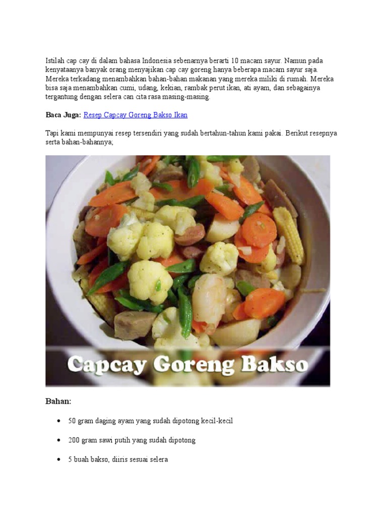 Resep capcay ala resto dan cara membuat capcay komplit serta olahan capcay seafood lengkap resep capcay royco praktis dan tumis sayur capcay enak mudah. Cap cay adalah makanan khas orang hokkian yang secara harafiah kata cap dalam bahasa mandarin berarti angka 10, karena memang ada 10 jenis sayuran untuk lebih jelasnya bagaimana memasak cap cay silahkan simak resep dalam aplikasi resep capcay enak bergizi berikut ini. Intinya, masak capcay itu sangatlah mudah! Capcay a la solaria enak lainnya. 13.139 resep cap cay ala rumahan yang mudah dan enak dari komunitas memasak terbesar dunia!